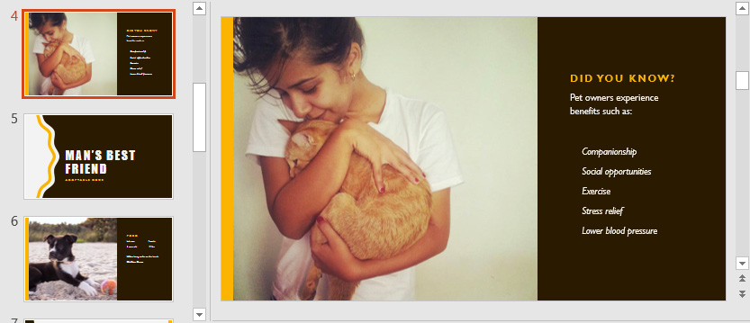 This pane allows you to jump between slides quickly, see the order of your presentation, and make changes to slide arrangement without leaving the main editing view.