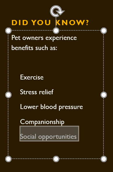 - Move the text 'Lower blood pressure' so it appears between 'Companionship' and 'Social opportunities'.