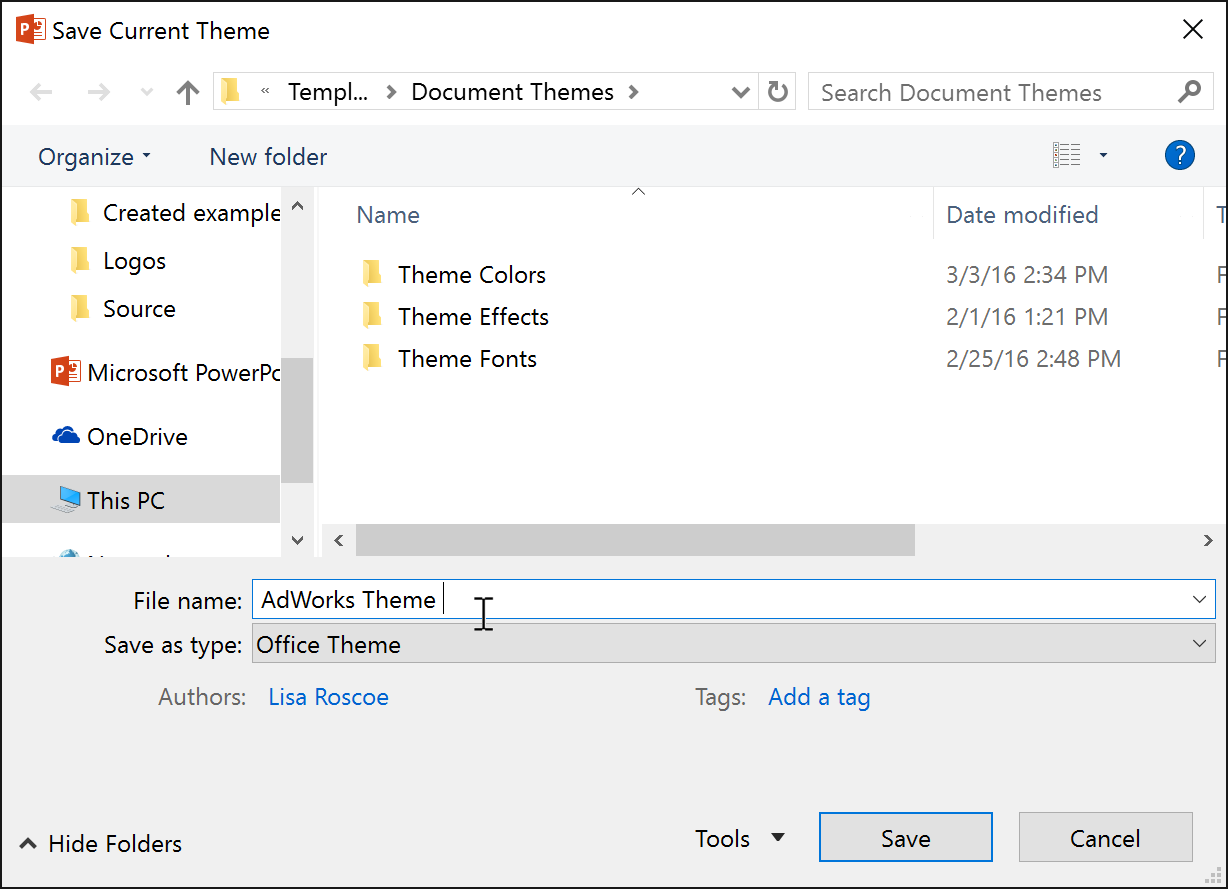 Enter a name for the theme and click Save. The theme will appear in the Custom section of the theme gallery.