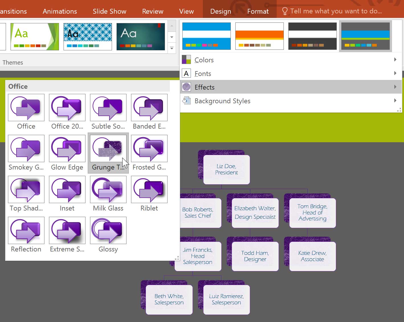 To apply a different effect style, open the Design tab, click Variants, select Effects, and choose the desired effect.