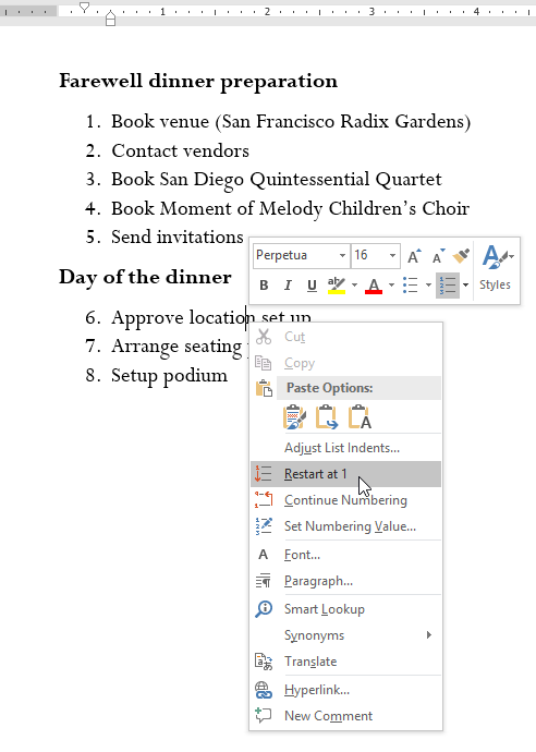 Right-click a numbered list to restart numbering at 1 or continue numbering from a previous list.