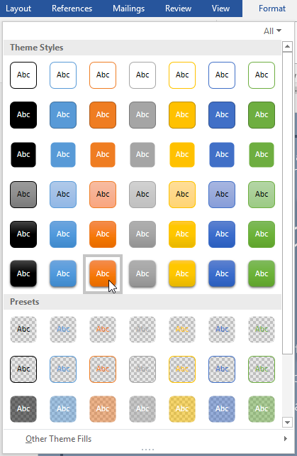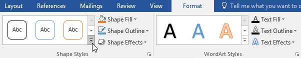 When a text box is selected, the Format tab appears. Use Shape Styles to quickly apply preset fill, outline, and effect combinations.